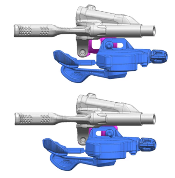 Le levier de déclenchement d’un levier de vitesse RAPIDFIRE Plus est tiré vers la poignée comme la gâchette d’un pistolet. Le levier de déclenchement des nouveaux leviers de commande RAPIDFIRE Plus de ALIVIO à XTR peut être actionné de la même manière. Il permet également de changer de vitesse par pression du pouce